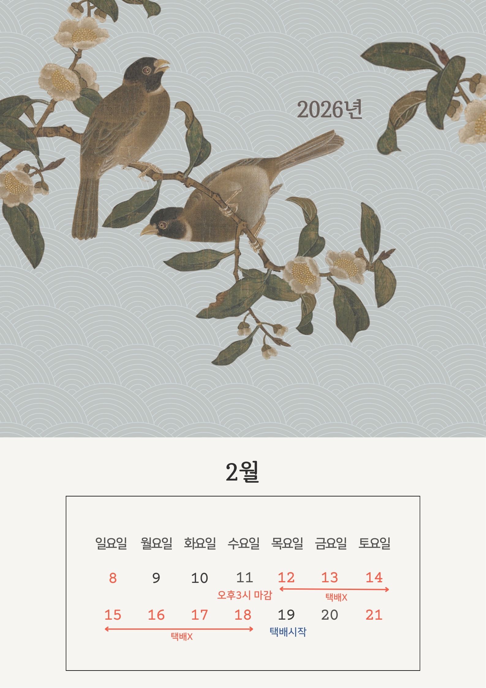 공지 | [26년 2월 설날 배송공지] 페이지 정보 작성자 gongboocha 쪽지보내기 메일보내기 홈페이지 자기소개 아이디로 검색 전체게시물 쪽지보내기 메일보내기 홈페이지 자기소개 아이디로 검색 전체게시물 작성일26-02-02 16:27 조회30회 목록 본문 안녕하세요 천지운 공부차입니다.다가오는 2월 설연휴 배송공지 안내드립니다.2월11일(수) 오후3시 마감*이후 접수는 가능하나 명절이후 도착할 가능성이 있습니다.감사합니다.2월12일(목) ~ 18일(수)까지 배송 불가19일부터 배송시작