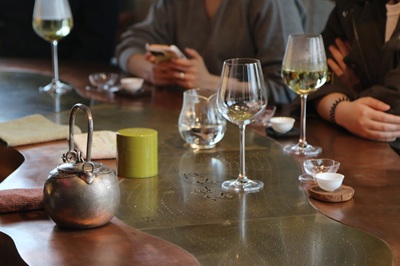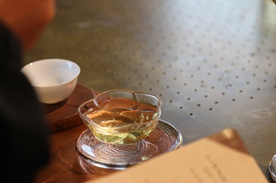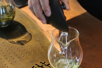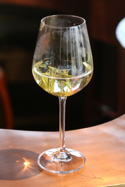 용정차를 우린 후 와인잔에 옮겨 담았습니다.