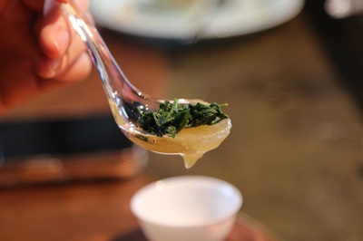 유자청에 교쿠로세이로의 찾잎을 얹어 먹으면 마치 부드러운 산나물이