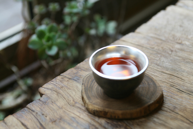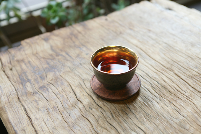 잔에 차를 담으니 금잔의 매력이 더욱 돋보입니다.