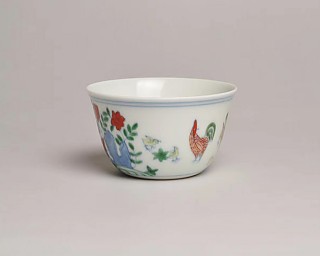 청백자에 세필로 청화를 그리고 화려하게 채색을 한 찻잔입니다.