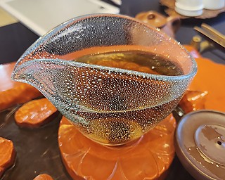 촘촘하고 작은 물방울들이 매력적인 공도배입니다. 은은한 하늘색으로 작은 호수를 바라보고 있는 느낌입니다. 길쭉하게 빠져있는 입전으로 출수와 절수가 좋습니다. 크리스탈로 제작된 숙우로 열에 강합니다.