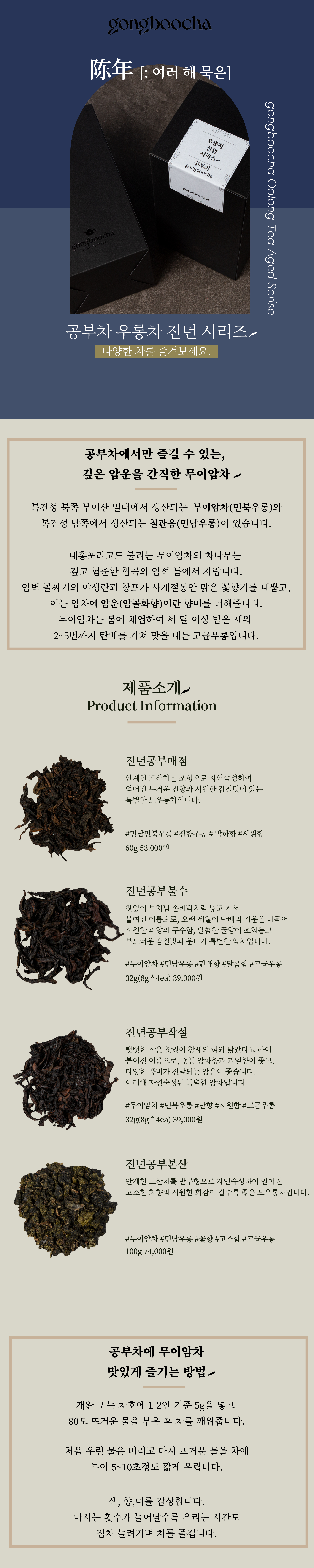 무이암차 계열의 우롱차만을 모았습니다. 발효된지 7년이상 된 차들로 향과 맛이 가장 좋을 때입니다. 묵직하면서도 화사함이 입안을 즐겁게 해주는 암차계열의 우롱차를 즐겨보세요.